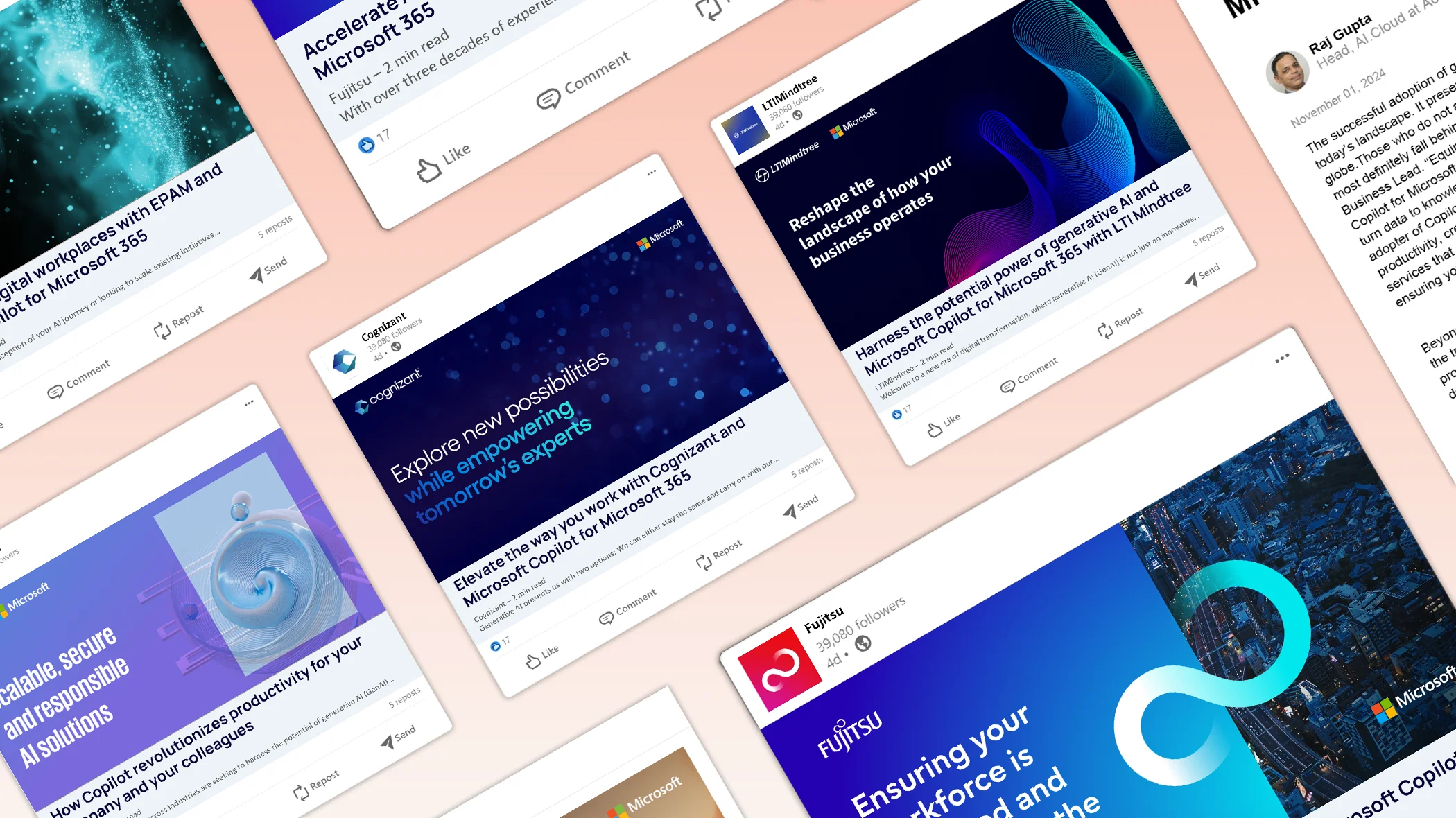 We worked with more than thirteen key Microsoft partners to share their Copilot success stories in their own voice and style. Each brand was analyzed and given a unique narrative, supported by materials such as eBooks, infographics, and LinkedIn campaigns. Together these stories highlighted how Copilot for Microsoft 365 delivered meaningful results across global partners while staying in continuity with Microsoft’s broader Copilot vision. The result was a unified celebration of partner success and the impact of Copilot across the ecosystem.